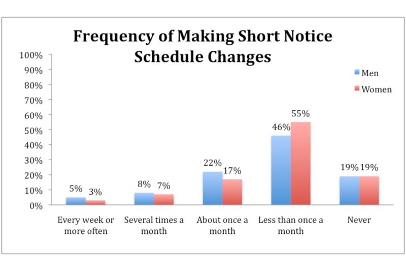 Usage of flexibility follows a similar pattern with men using various types of flexibility more than women, except for part-time work (more women work part time than men). For example, men flex their schedules more often than women: