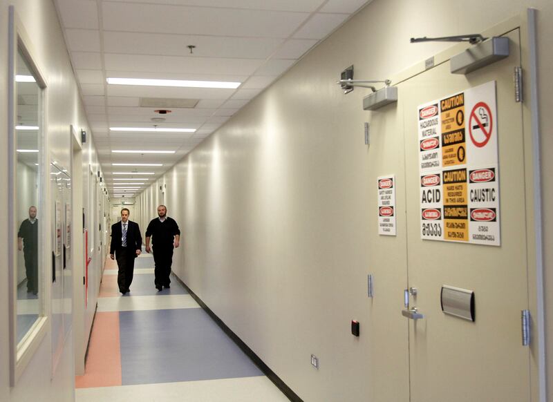 Employees walk in the corridor during a media tour of the Central Public Health Reference Laboratory (CPHRL) in Tbilisi, March 16, 2011.