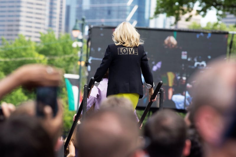 On March 18, the date of Biden’s kick-off rally in Pennsylvania, Dr. Biden wore a highlighter yellow dress with a blazer. “LOVE” was written on the back of it. The flourish was a bit kitsch, but one can imagine other women her age might own something similar.
