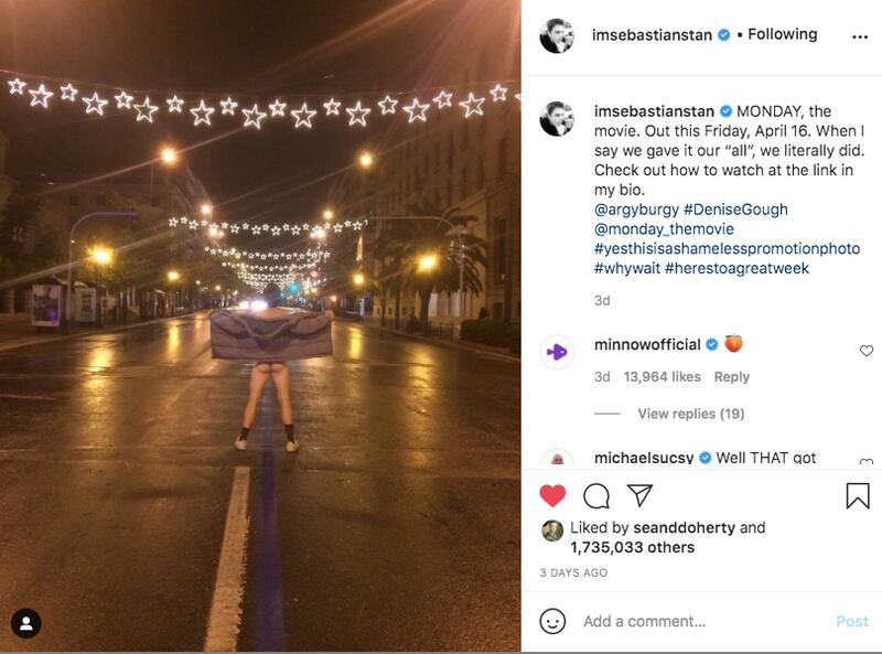 To promote his new movie Monday, out Friday, The Falcon and the Winter Soldier star Sebastian Stan posted a photo on his Instagram of himself flashing an empty street, his bare bum—or whatever the butt equivalent of underboob is—gloriously peeking out from under his coat. “When I say we gave it our ‘all,’ we literally did,” he captioned, teasing the film’s nudity.